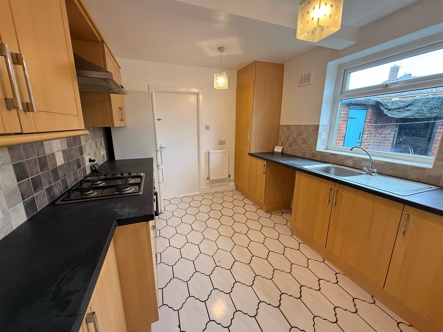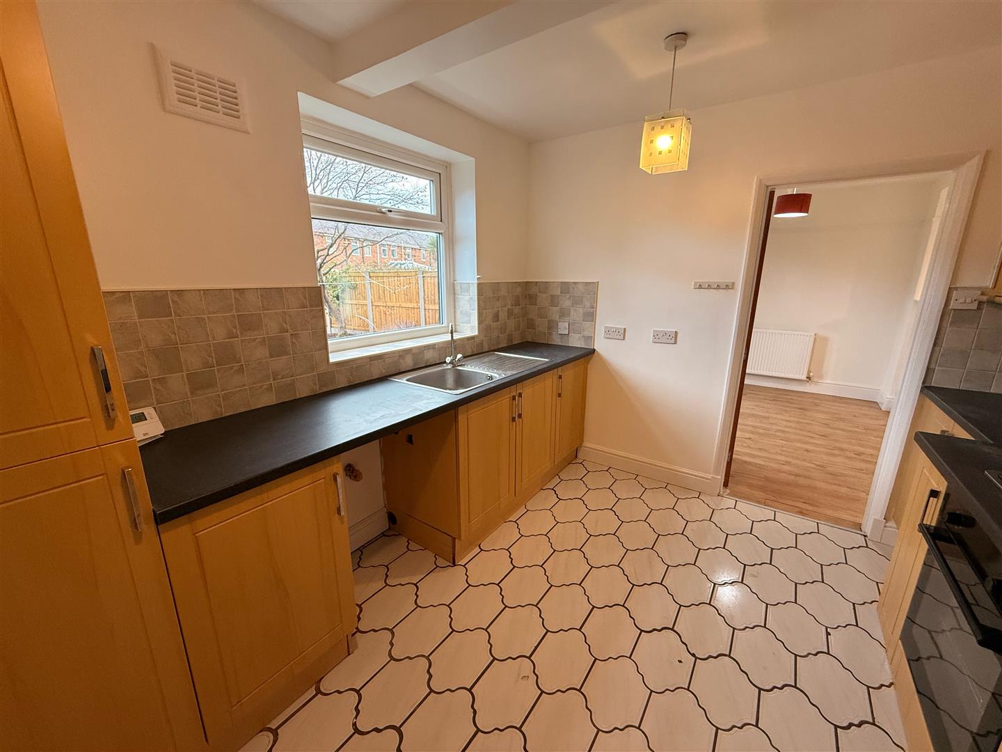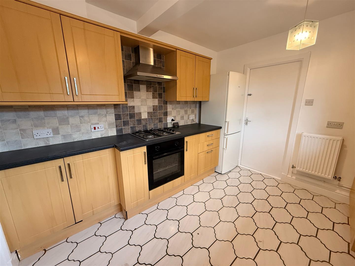 Kitchen with built in oven, hob and extractor, with space for a washing machine