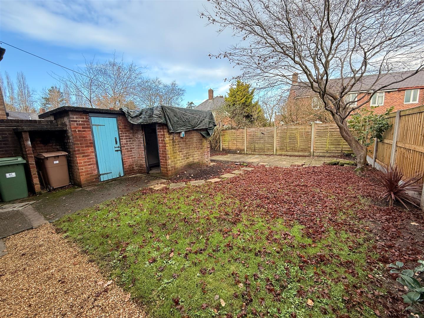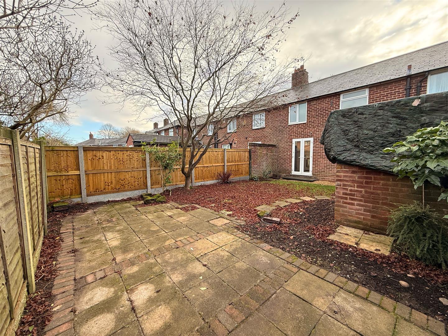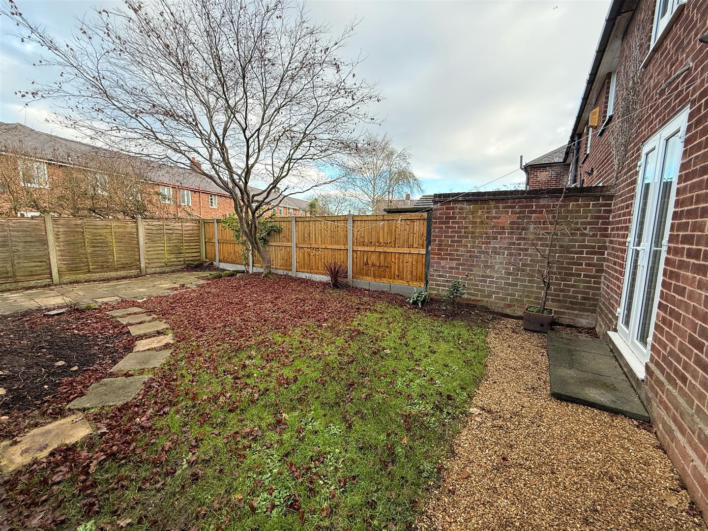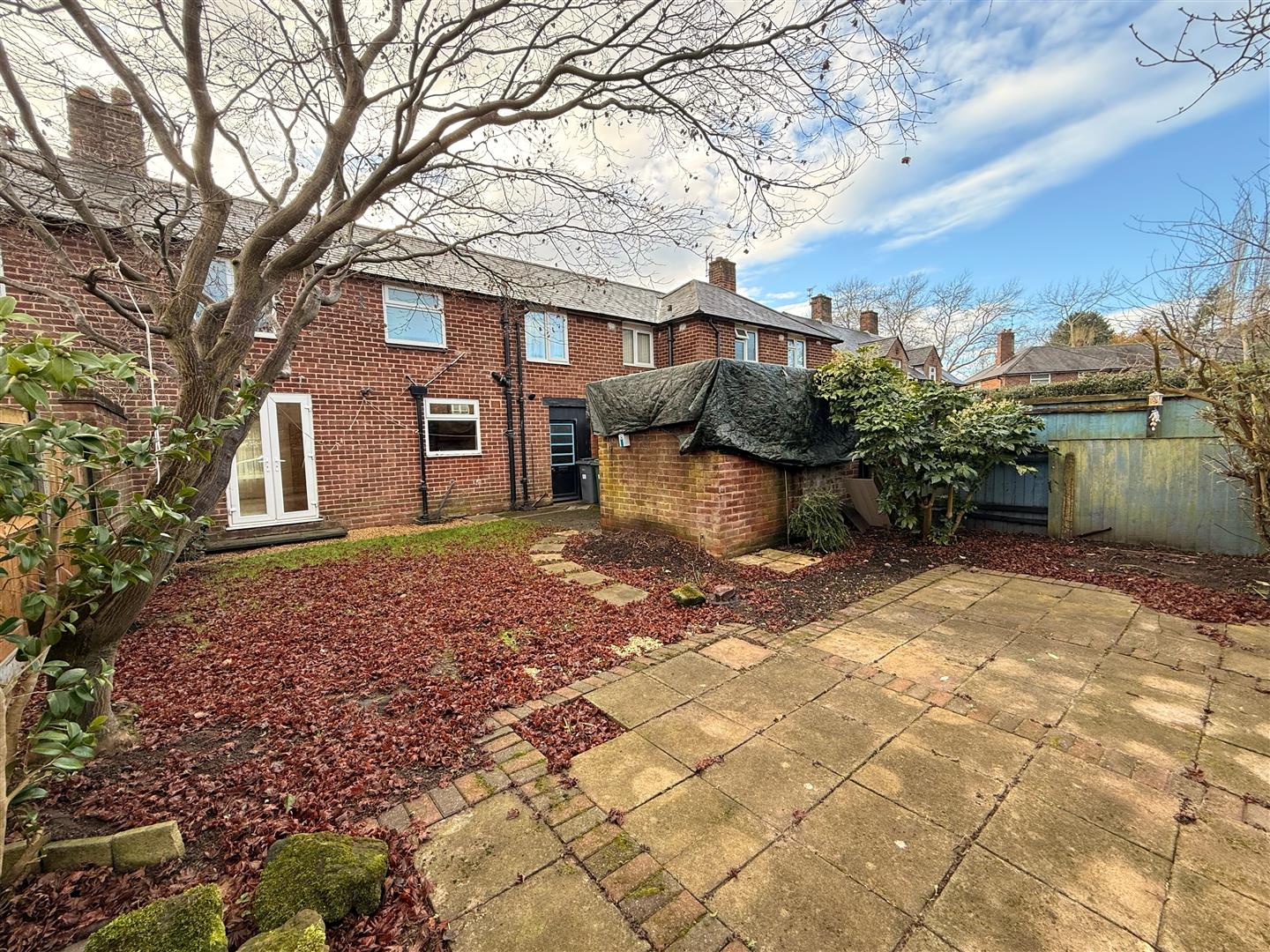Rear garden with large patio area.