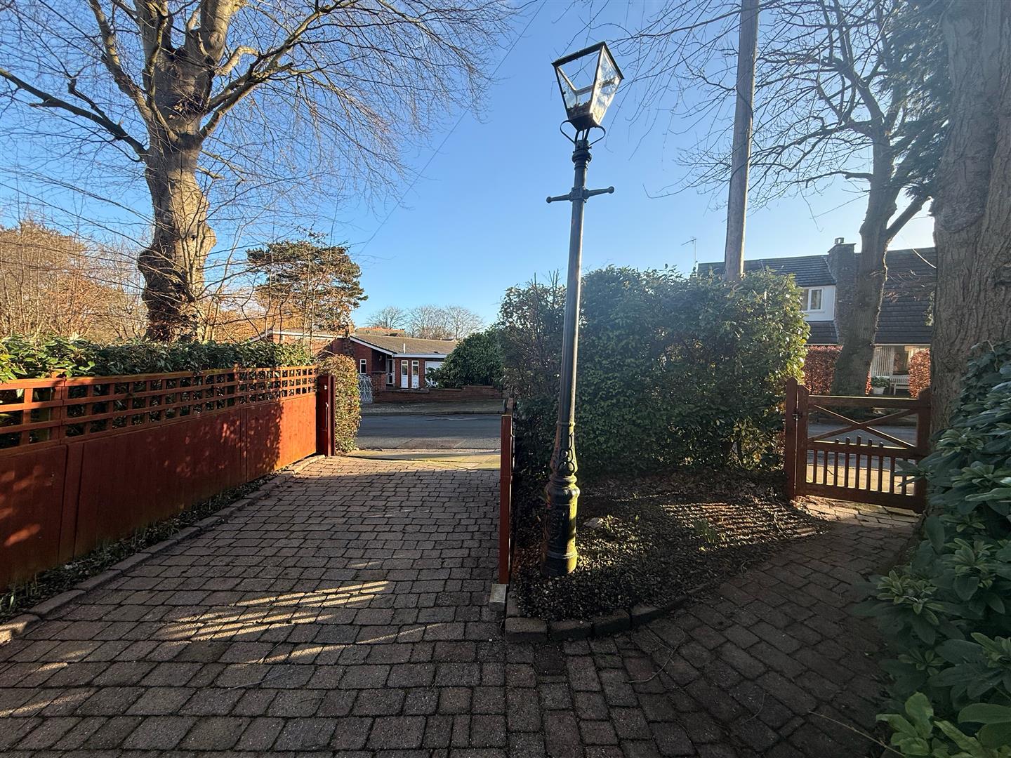 The property is set back from the road and accessed via a private driveway leading to an open courtyard with garage and rear access.